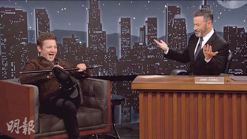 【明報專訊】「鷹眼」謝洛美溫納(Jeremy Renner)今年元旦在內華達州牧場為救外甥遭剷雪車輾壓重傷,兩度接受手術並在深切治療部留醫;逐漸康復的他早前接受美國廣播公司女主播戴安索耶(Diane Sawyer)訪問,並於上周播出,前日再亮相奧斯卡頒獎禮司儀基梅爾(Jimmy Kimmel)主持的清談節目,雖撐着拐杖但行動自如,更在一衆現場觀衆面前展舞姿。斷骨35條的他受重傷險死,自覺很幸運,又稱留醫期間輕了20磅,並成功戒掉吸煙惡習,「幾乎死亡,就沒想過吸煙,其實很容易戒」。