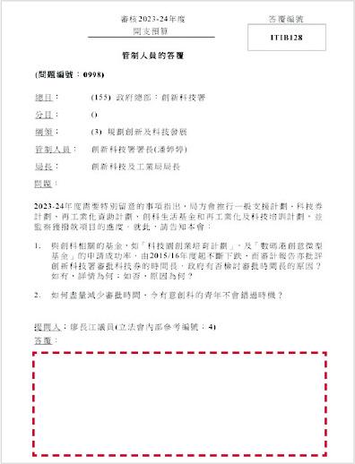 【明報專訊】立法會財委會一連幾日開會審議政府本年度嘅開支預算,各政策局陸續回覆議員嘅書面質詢,其中創新科技及工業局嘅答覆前日傍晚上載到立法會網頁。創科局一共答覆263條提問,不過直至噚日下午兩點半,由立法會議員廖長江向創新科技署提出關於與創科相關基金嘅質詢,答覆就「空白一片」,仲畀人「cap圖」喺網上廣傳,被指「交白卷」。Emily於是向創科局查詢,相隔近一個鐘後,當局先「補答」問題,創科局就話文件已重新上載,對事件冇回應。