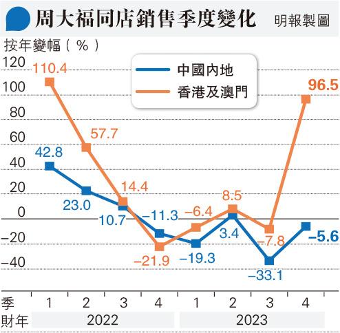 【明報專訊】周大福(1929)公布,截至今年3月31日止第四季度同店銷售增長改善,內地市場雖未扭轉跌勢,按年下降5.6%,但比第三季度33.1%的跌幅顯著收窄,而港澳市場更按年大增96.5%。該集團解釋,由於內地防疫政策轉變,內地及港澳人員流動及零售活動於第四季度已呈現復蘇迹象,故內地同店銷售降幅按季改善,而港澳市場亦受惠內地邊境口岸重開而報升,當中本港和澳門分別增長1.55倍和26%。