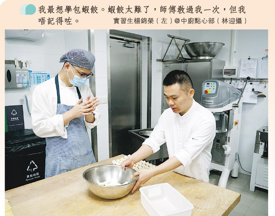 與全無工作經驗的陳新不同,23歲的楊錦榮曾在另一餐廳後廚幫手,他同樣患有智力遲緩。這次是他自己選擇到中廚點心部實習,負責搓麵糰、製作包點等。負責帶他的江師傅稱讚他「領悟力幾好」,「教兩三次就識,叉燒酥都識包」。酒店員工通道錯綜複雜,要記住餐廳、休息室、洗手間等不同位置已不容易,楊錦榮說「有好多道門,一開始唔知邊道打邊道,但師傅帶過幾次,我就自己可以上5樓送貨」。他謙虛說,點心房仍有很多東西要學習,「我最想學包蝦餃。蝦餃太難了,師傅教過我一次,但我唔記得咗」。