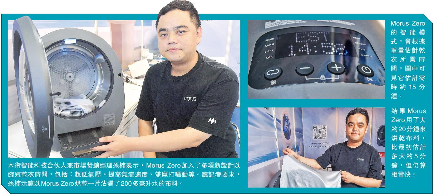 孫楠表示,Morus Zero烘乾衣物所需時間視乎衣物和水分多少而定,一般1.5公斤洗衣機脫水後的濕衣物,大約需50分鐘,若只是烘乾極小量衣物,例如單件衣服最快只需15分鐘。