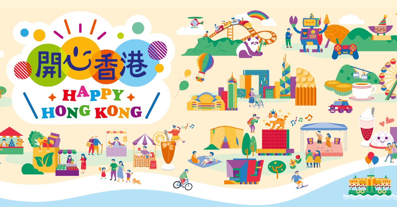 「開心香港」(Happy Hong Kong)重點活動之一:大型美食市集,將於4月、5月及6月在港島、九龍和新界,共舉行3場,設有不同主題,市民可免費入場。4月首場美食巿集,本周末(4月29至30日)在灣仔會展舉行,需持票入場。4月26日上午8時起18區民政諮詢中心免費派發入場票。政府將印製10萬張門票。