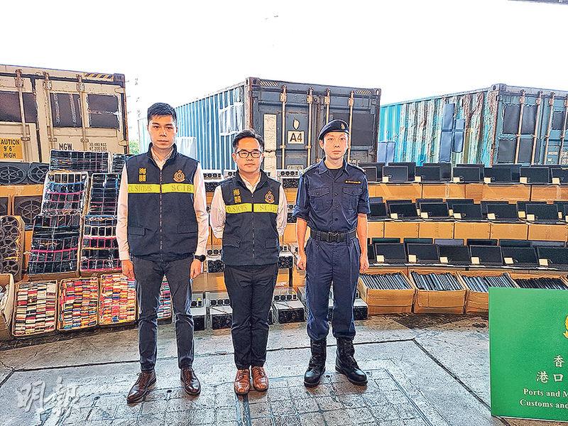 【明報專訊】海關在屯門海面截查一艘開往內地的內河船,在5個貨櫃檢獲一批約值1800萬元的走私電子產品,包括35部虛擬貨幣「掘礦機」、手提電話等,拘捕涉案兩間貨運公司一男一女董事。