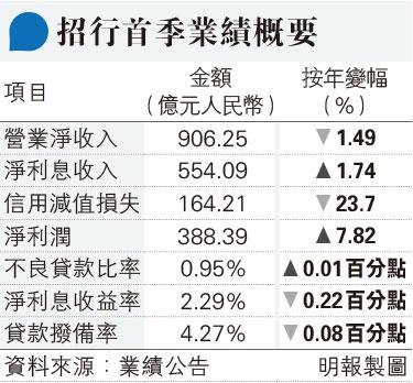 【明報專訊】招商銀行(3968)公布截至3月底的首季業績,盈利增長7.82%至388.39億元(人民幣,下同),每股盈利1.54元,營業淨收入906.25億元,跌1.49%,淨利息收入升1.74%至554.09億元,當中淨利息收益率按年跌22個基點至2.29%。