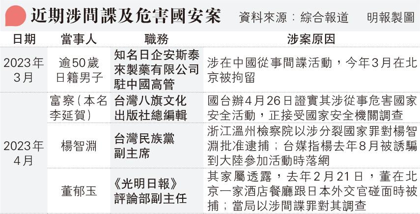 【明報專訊】十四屆全國人大常委會第二次會議周三(26日)表決通過了新修訂的《反間諜法》,將於今年7月1日起施行。官方昨日公布新版《反間諜法》顯示,把「投靠間諜組織及其代理人」列入間諜行為,並完善反間諜行政執法職權,增加查閱調取數據、傳喚、查詢財產信息、不准出入境等行政執法職權。
