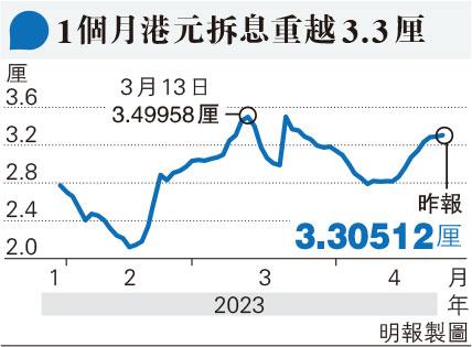 【明報專訊】美聯儲下周開會議息前,與樓按相關的一個月拆息連升8日,觸3.3厘,為5個月高位。隨着拆息向上,港美一個月拆息的息差收窄至約1.7厘。惟港匯表現較弱,昨曾低見7.85元。市場人士認為,美國5月加息25點子已成市場共識,拆息是預先反映利率向上。由於銀行體系結餘水平處於低位,料港銀今次有機會跟隨加息。