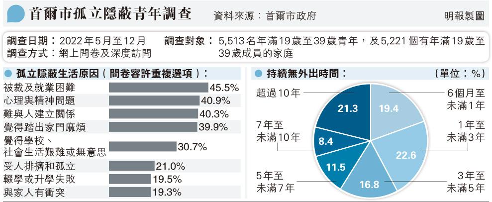 首爾市政府4月25日起啟動針對年滿19歲至39歲隱蔽、孤立青年的一站式支援計劃,向持續處於「情緒上、物理上」孤立情况,起碼6個月沒離開過家裏的人士提供援助。首爾市政府準備一改等待當事人尋求援助的方式,擬活用地區社會網絡和互聯網大數據等,主動找出那些隱蔽青年。一旦發現,即通過問卷調查、商談等方式,了解當事人的隱蔽孤僻程度,依據評估結果將他們分門別類,從而提供切合支援辦法。那包括提供一年20萬韓圜(1172港元)的表演參觀贈券、海外義工服務或工作體驗、為期5年的精神疾病診斷治療、職業訓練及求職援助等。