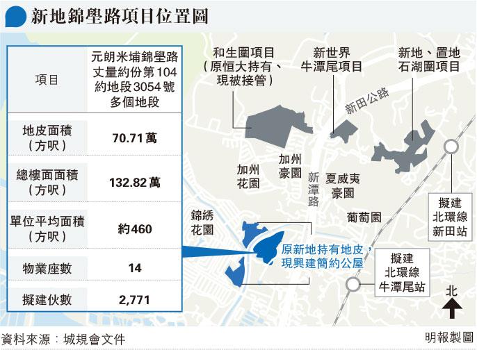 【明報專訊】發展商積極拓展新界西北用地,新地(0016)持有的元朗米埔錦壆路項目,原獲批建洋房項目,2021年向城規會改作分層戶發展,由71幢洋房大增約38倍至2771伙、平均面積約460方呎的分層住宅,同時加入社福元素,項目總樓面約132.82萬方呎。據規劃署文件顯示,該署原則上不反對有關申請,預計明日將獲城規會通過。
