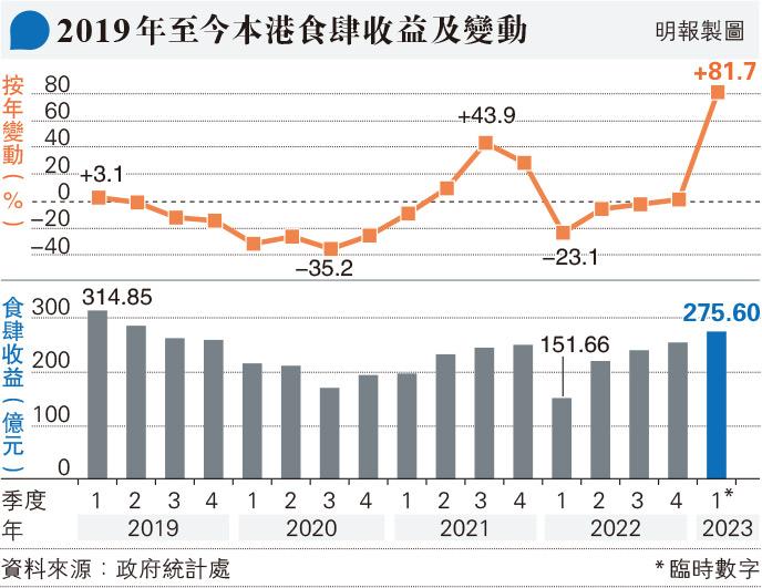 政府發言人表示,隨着本地活動復常和訪港旅客反彈,食肆業在今年首季顯著改善,在去年低基數之下,食肆總收益價值按年急升81.7%。展望未來,食肆業務將繼續受惠於個人消費和訪港旅遊業的復蘇,新一輪消費券亦會有所幫助。