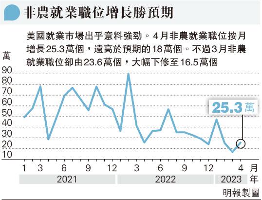 【明報專訊】儘管美聯儲持續加息,且地區銀行處於動盪,美國就業市場卻出乎意料強勁。4月非農就業職位按月增長25.3萬個,遠高於預期的18萬個。不過3月非農就業職位卻由23.6萬個,大幅下修至16.5萬個。美國4月失業率則下調0.1個百分點至3.4%,重返逾半世紀低位,分析師原預期微升至3.6%。美股三大指數早段向上,受蘋果(美:AAPL)升勢帶動,道指早段升逾400點。