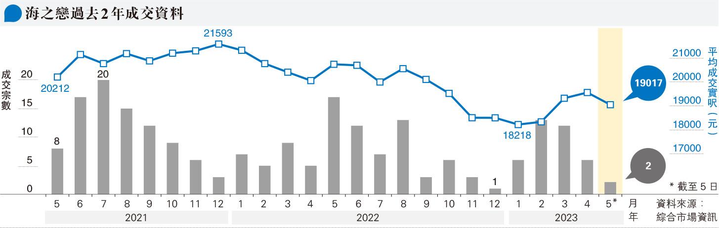 【明報專訊】經濟復常,不少大型屋苑的平均呎價,近期都創出新高;荃灣半新盤海之戀因為樓齡較新,屬區內受歡迎屋苑之一,惟價錢較廉宜的放盤多已被市場消化,5月份截至5日暫錄2宗成交,平均成交實呎約1.9萬元。