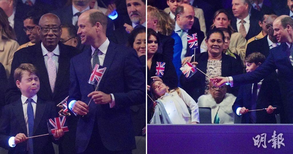 英王查理斯三世加冕音樂會周日(7日)晚在溫莎堡舉行,王儲伉儷威廉及凱特帶同其中兩名子女喬治小王子和夏洛特小公主出席。觀看音樂會時,威廉調皮地在喬治的臉前揮動小國旗,喬治被作弄了扁扁嘴,夏洛特似乎發現了爸爸的小動作,及時避開「攻擊」,三人互動的畫面很是有趣。(每日郵報)[2萬人同歡 威廉向父致敬:我們為你驕傲]