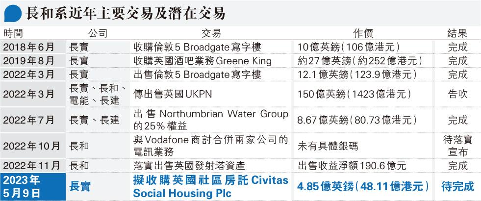 另外,長實在去年3月出售倫敦核心商業寫字樓5 Broadgate,交易作價123.9億元,淨套現74.67億元。該系公司及後亦將手上Northumbrian Water Group的25%權益出售,套現80.73億元。總結近年長和系在英國多項出售交易,淨套現共346.09億元。若非去年擬出售英國電力業務UKPN最終告吹,未能締造過千億元交易,否則套現金額將更多。