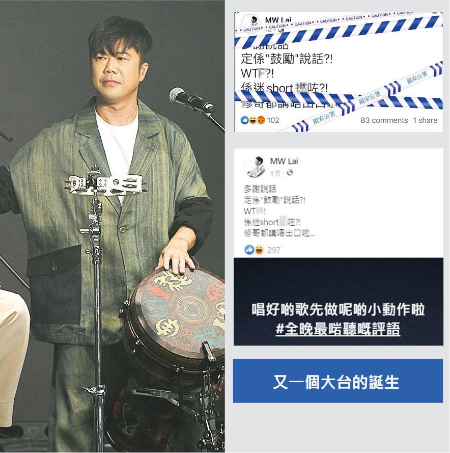 【明報專訊】ViuTV音樂頒獎禮《CHILL CLUB推介榜 年度推介22/23》周日(7日)舉行,MIRROR成員姜濤奪年度男歌手銀獎時,在台上逐一向11名隊友發表「兄弟宣言」成熱話。有人讚姜濤真誠,也有質疑他的謝辭有機心,暴露成員缺點,在不適當場合公開點評隊友。獲年度樂隊銀獎的RubberBand(RB)未有出席領獎,鼓手泥鯭(黎萬宏)有留意頒獎禮,當晚在社交網連環爆粗發文,暗諷姜濤,「係咪short咗?修哥都講唔出口啦……」隨即惹來鏡粉圍攻,昨日他將帖文改圖並留言:「與有榮焉」。