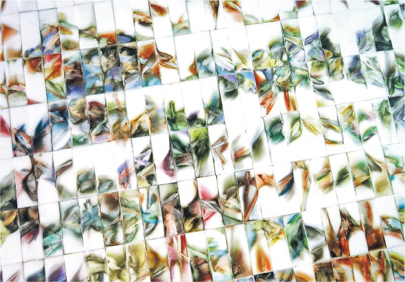 張馨儀的作品《擦拭新聞:天橋底下植物與石變奏曲》秉承她過往《擦拭新聞》系列,遠看像大理石質地,其實用擦膠擦報紙以取得顏色,一小塊一小塊構成畫面,今次就以香港天橋底下的空間為題。她觀察到天橋底下通常會有大石,讓人不得露宿,但同時植物叢生。石頭和植物組成的空間讓她聯想凝固的河流,隨之而來是凝固時間的感覺。她就以景象想到「摸着石頭過河」來回應去年9月中至10月中一連串世界大事,其間包括英女王逝世。處身時代洪流,人如同「摸着石頭過河」。