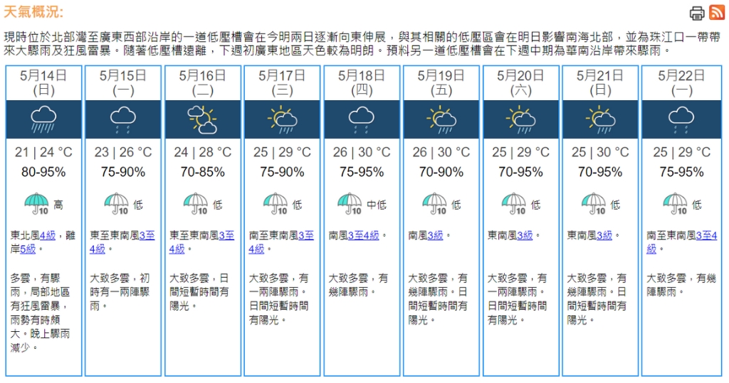 【20:15】位於北部灣至廣東西部沿岸的低壓槽正為該區帶來驟雨。預測本港地區今晚(13日)及明日(14日,母親節)多雲,有驟雨。明日雨勢有時頗大,局部地區有狂風雷暴,明晚驟雨減少。氣溫介乎21°C至24°C。吹和緩東北風,明日離岸風勢清勁。展望隨後一兩日天色較為明朗。下周中期氣溫回升。