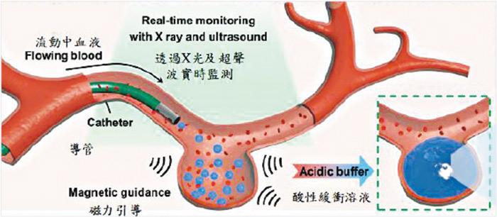 中大醫學院影像及介入放射學系教授余俊豪、工程學院機械與自動化工程學系教授張立領導的團隊開發「自粘微凝膠集群」,用作填充動脈瘤的微型機械人,每個構件為一個微型球體,每個球體由pH響應型自癒水凝膠基質、磁性納米粒子和造影摻雜物組成。在導管和實時圖像引導下,大量微凝膠置入並集中到動脈瘤囊中。當加入酸性溶液時,微凝膠之間的自粘機制被激活,將它們焊接成整體,填充動脈瘤(圖)。