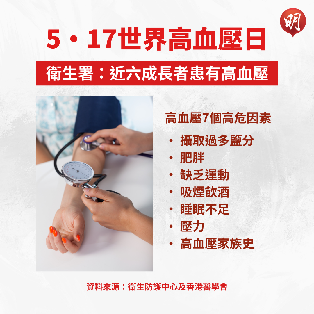 每年5月17日是「世界高血壓日」,衛生署2020至22年度人口健康調查顯示,本港15至84歲人士的高血壓總患病率為29.5%(女性為26.2%,男性為33.2%),高血壓總患病率隨年齡增長而持續上升,比例由15至24歲的4.9%,上升至65至84歲的57.4%,即本港近六成長者患有高血壓。署方呼籲市民保持健康的生活模式,以預防和控制高血壓,建議18歲或以上成年人,至少每兩年量度血壓一次,量度血壓密度需因應血壓水平、年齡、患冠心病的綜合風險以及醫生建議而提高。