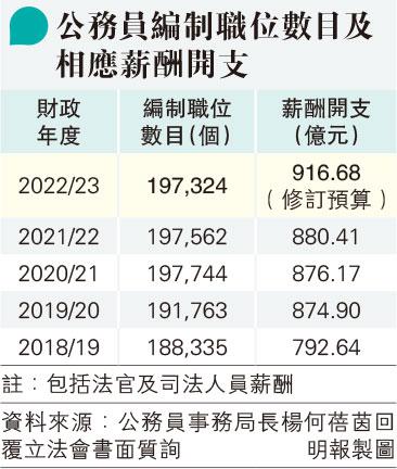 【明報專訊】政府控制公務員編制「零增長」下,公務員薪酬開支逐年上升。公務員事務局長楊何蓓茵昨日書面回覆立法會議員質詢時透露,最新2022/23年度公務員編制職位為逾19.73萬個,較上一年度減少230多個。經修訂預算的2022/23年度公務員薪酬總開支則增至916.68億元,較2021/22年度增加約36億元,為近年新高(見表)。