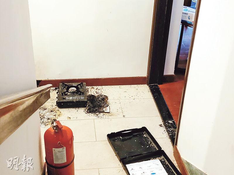 警方在單位門外走廊檢獲卡式石油氣爐,地上有燒剩紙張灰燼,案件列作縱火案,交由中區警區刑事調查隊跟進。