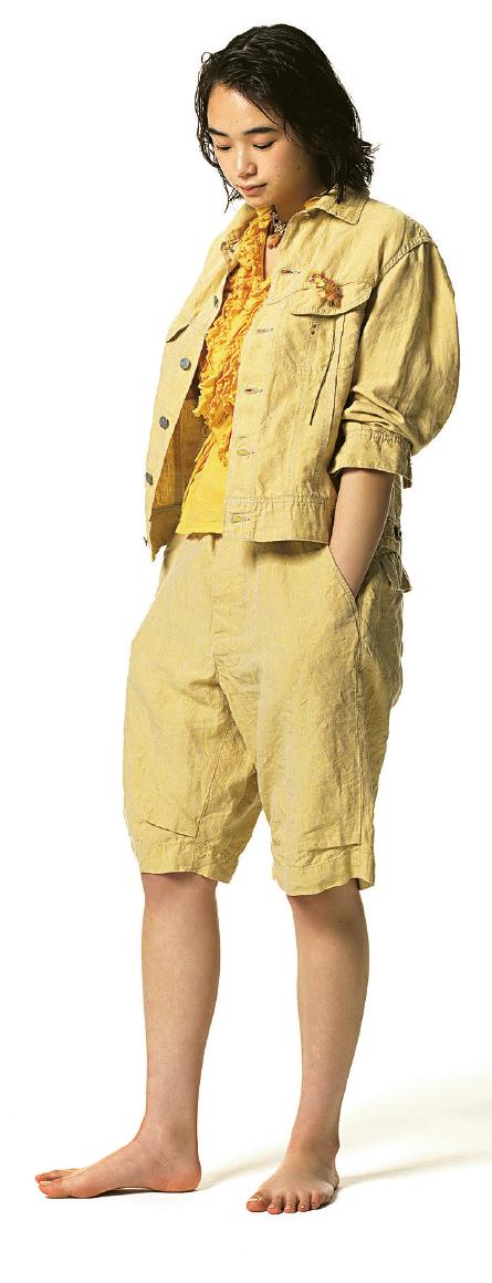 Super Gauze Anuenue(D)的一系列針織單品,由45R工匠仔細計算彩色線的順序,並以優質的Supima紗線精心編織成彩虹般的圖案。不論是背心或短袖剪裁,細膩的針織縫紉及親膚的物料,穿上如T恤一樣令人舒適自在。Gima Lace系列(E)則用上彩虹般豐富多彩的Zimba Gima(疑麻)紗線。Gima是45R以特別的棉紗模仿亞麻布的織法,製作舒適如全棉,紋理和手感卻與亞麻同出一轍的布料,解決天然亞麻布容易縮水和變黃的缺點,是美觀又實用的一種新世代布料。●