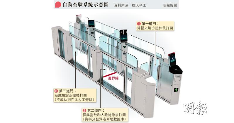 現行粵港口岸自助通關,要通過出入境雙方共兩個「兩道門」查驗系統辦理出入境手續。航天科工此套「三道門」查驗系統,設備跨界安裝,無口岸過渡緩衝區域,旅客僅需排一次隊,即可完成出入境查驗流程。