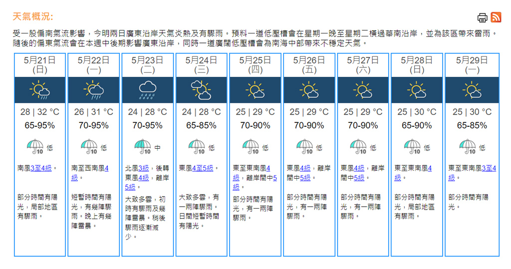即時熱點 天氣|天文台:天氣炎熱最高32℃ 局部地區有驟雨 (11:23) 發佈於 2 年 前 2023 年 5 月 21 日 By 明報 上午11時,天文台錄得氣溫30.1°C,相對濕度79%。一股偏南氣流正為廣東沿岸帶來炎熱及有驟雨的天氣。天文台預測,本港地區今日(21日)天氣炎熱,最高氣溫32°C,部分時間有陽光,局部地區有驟雨。吹和緩偏南風。展望明日(22日)仍然炎熱及有幾陣驟雨,周二(23日)初時驟雨較多及有幾陣雷暴。本周中後期部分時間有陽光,亦有一兩陣驟雨。(天文台)[實用資訊:熱衰竭中暑急救方法] 相關文章:天文台天氣天氣速遞編輯推介 Up Next G7峰會領袖獲贈紙鶴金屬複製品 源自廣島女童臨終前所摺紙鶴象徵和平 (14:22) 不要錯過 澳洲刷尾袋鼠數量回升 反映有力野外繁殖 (15:02) 繼續閱讀 贊助商 猜你喜歡 風神|天文台:下周一考慮直接發三號波 將評估需否發更高風球 下周二至四料低至20°C (16:53) 天氣|天文台:周五有驟雨 氣溫28至32°C (19:45) 天氣|天文台:周四局部地區有驟雨 日間炎熱最高32°C (21:00) 天氣|天文台:今早多處地區錄5毫米雨量 今日多雲有驟雨 下午部分地區雨勢較大有雷暴 (09:20) 天氣|酷熱警告生效 天文台:周末有一兩陣驟雨 (08:22) 天氣|天文台:周四天晴局部地區有驟雨 最高32°C (20:56)