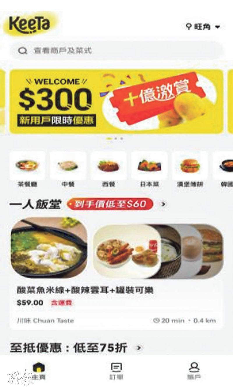 【明報專訊】外賣平台美團(3690)首次衝出內地市場,旗下新外賣平台「KeeTa」今日正式進駐香港,以旺角、大角嘴為首批地區試點。美團表示,服務將逐步拓展至新區域,並預料今年底達至全港覆蓋。為了吸納用戶,美團推出「十億激賞」計劃吸客,包括餐飲優惠及免運費等,每位新註冊用戶可獲價值300元優惠券。KeeTa App將於今日早上8時餐廳營業後,正式投入服務。