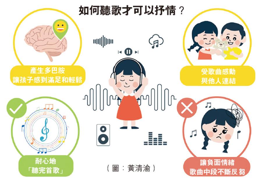 青少年期可算是人生中,情感發展最豐富、同時最波動的時期。正因為歌曲對人情緒的正面作用,不少青少年在感到壓力或不愉快時,也會在音樂中尋找安慰。台灣學者蔡振家的團隊,就透過量度實驗參加者在聽歌期間的手指溫度變化,發現如果要在抒情歌得到治癒,就需要將歌曲完整地聽完。實驗發現,聽者在聽歌時手指溫度會下降,顯示聽者的情緒相對緊張起伏;而在副歌旋律在尾段重複出現時,編曲或歌詞一般都有或多或少的改變,手指溫度會回升,腦中負責調降負向情緒的部分,會比歌曲中段時有更多活動,助聽者對歌曲描述的事情有嶄新而較正面的詮釋。