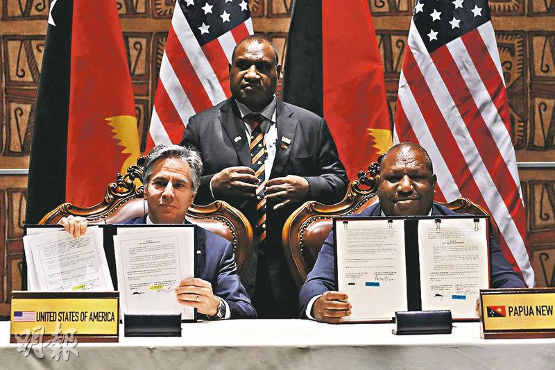 【明報專訊】美國國務卿布林肯昨日同樣到訪巴布亞新幾內亞(簡稱巴新),與該國防長簽訂新的兩國防務合作協議,惟暫未對外公布協議內容。協議被指遏制中國意味濃厚,布林肯稱這「與其他國家無關」,期望與商界合作為巴新帶來數以百億美元計的新投資。中國外交部昨日表示,中方對有關各方同巴新等太平洋島國開展正常交往和平等互利合作不持異議,但需要警惕「以合作之名搞地緣政治博弈」,敦促「任何合作都不應當針對第三方」。