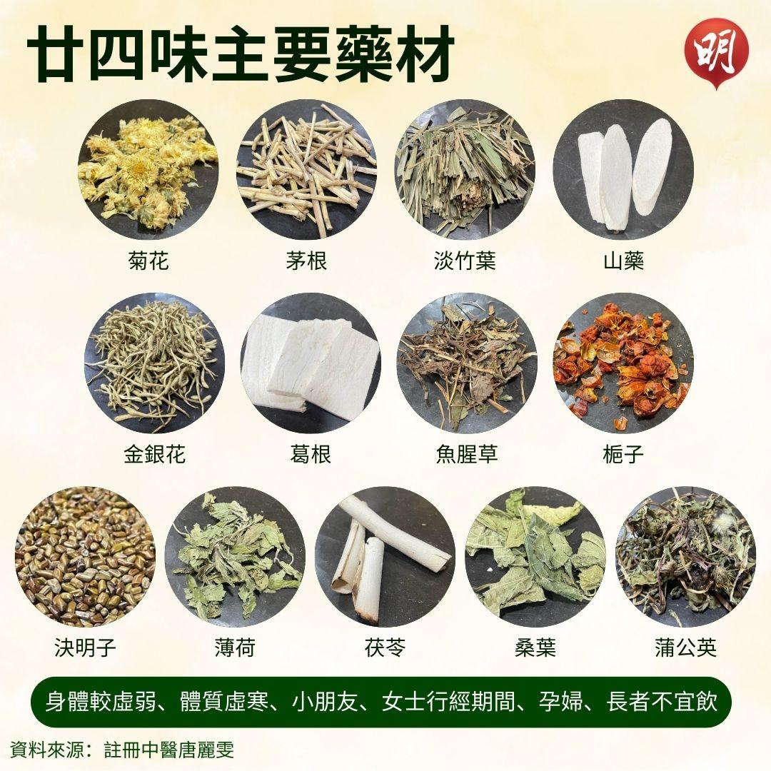廿四味是廣東人常飲涼茶之一,註冊中醫唐麗雯表示,廿四味有清熱解毒、祛濕利尿之效,惟廿四味屬較寒涼的涼茶,非人人啱飲,亦不應長期飲用。唐麗雯講解廿四味主要藥材及飲用注意,提醒各人體質不同,如有疑問,飲用前宜先諮詢註冊中醫。