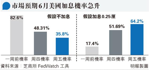 市場押注6月美聯儲加息0.25厘機率升至64.2%