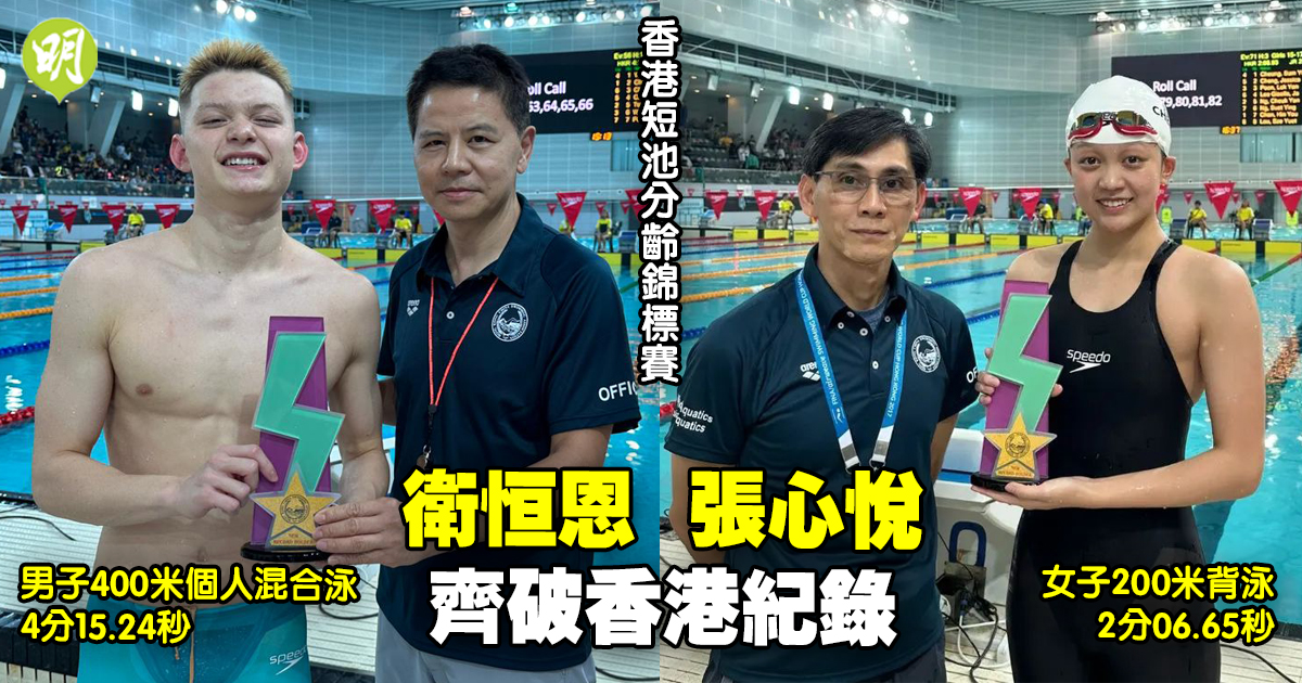 早前戰畢環地中海游泳系列賽的衛恒恩和張心悅,今日跟一眾港隊隊友轉戰香港短池分齡錦標賽,前者在強項400米個人混合泳中,以4分15.24秒首名觸池,同時將已故「飛魚」杜敬謙在2018年做出的短池港績(4分18.92秒)推快3.68秒。張榮恩則於同一項目游出4分21.07秒,打破香港男子15至17歲組分齡短池紀錄。