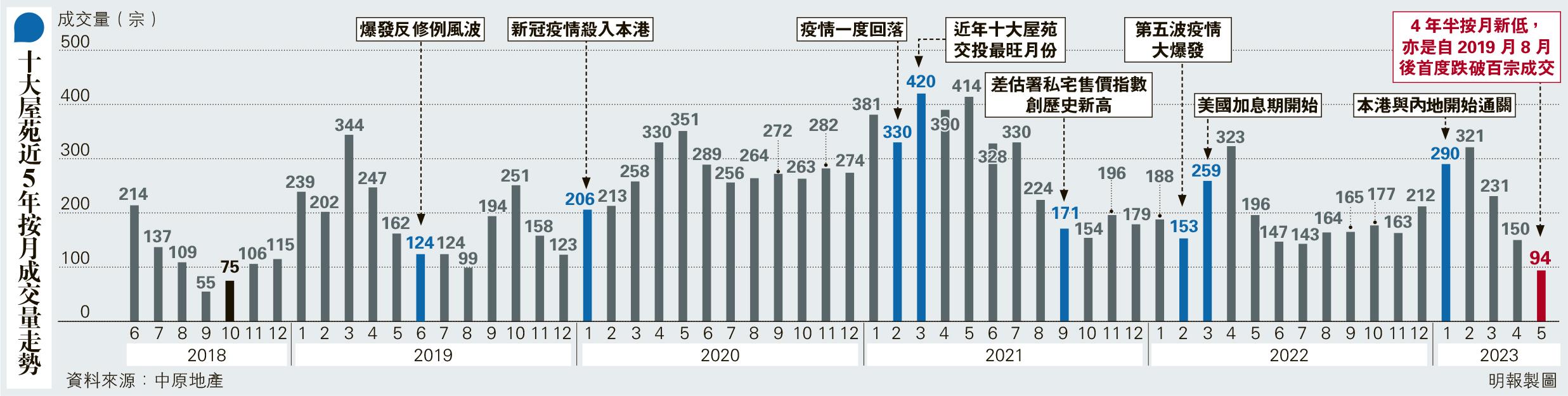 【明報專訊】近月新盤市場暢旺,但二手交投大幅回調,十大屋苑5月僅錄94宗成交,為2018年10月錄得75宗後,約4年半以來的按月新低(見圖),表現較去年初第五波疫情大爆發、本港與外地封關、政府實施多項社交距離措施時更差。若與今年4月比較,則按月下跌近四成。有分析認為,股市大跌,加上新盤搶客,買家觀望息口走勢,業主叫價仍然進取,料未來數月二手交投將續受壓。