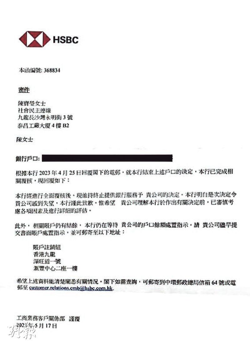 【明報專訊】社民連3個匯豐銀行戶口日前遭終止服務,部分戶口自社民連2006年創立已使用,至今已17年。社民連外務副主席周嘉發引述匯豐來函稱,經綜合評估後決定終止服務,但無提實際原因。他慨嘆過去市民「以前可用選票及鈔票支持(該黨),完善後的香港,兩樣都唔可以」。已解散的職工盟前成員杜振豪稱,前主席黃迺元3月時遭中國銀行(香港)終止戶口,引述該行解釋「睇完資料後過唔到風險評估」。