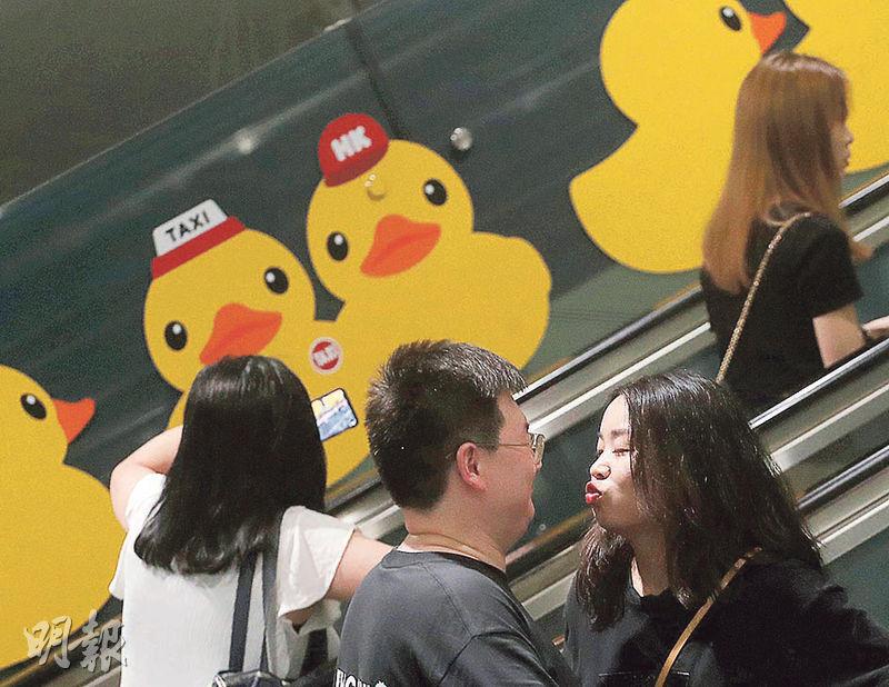 【明報專訊】如果大家返工返學經過金鐘站,一定發現已變咗「期間限定」嘅橡皮鴨主題車站,月台地面、扶手電梯、牆身都有出自荷蘭藝術家霍夫曼之手嘅橡皮鴨公仔,最矚目嘅應該係E出口巨型玻璃天窗貼住嘅鴨仔面。港鐵話橡皮鴨展覽由今個月10號開始,為配合展覽時間,主題車站會維持3星期,提醒市民打卡都要注意安全,到時站內唔同地點都會加派人手維持秩序。