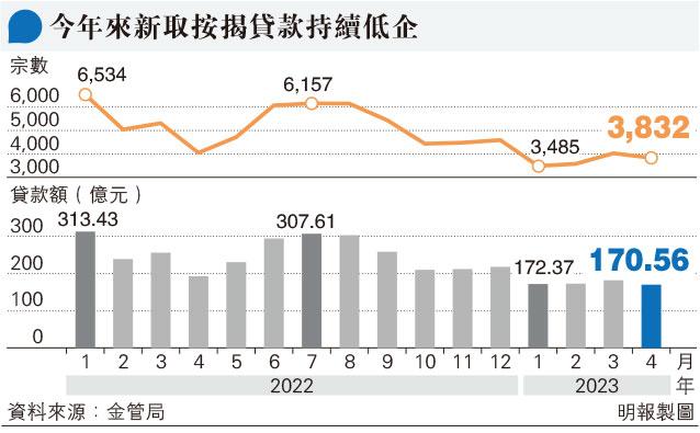 近月新盤市場暢旺吸收購買力,加上港股下跌,令二手交投大幅回調,十大屋苑5月僅錄94宗成交,為2018年10月錄得75宗後,約4年半以來的新低。一手成交多以建期供款,即到明年才會取用按揭,二手成交淡靜影響今年銀行按揭取用量,今年4月新取用按揭金額為170.56億元(見圖),較去年第五波疫情時,仍按年減少11.77%。首4個月新取用按揭金額為698.6億元,按年跌30.4%,為7年低位,以宗數計算則按年跌28.7%至1.49萬宗,見27年低位。