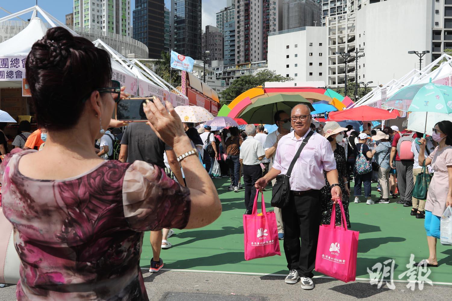 【17:25】維園足球場正舉行家鄉市集嘉年華。記者今日所見,進場市民以長者為主,不少人更攜帶購物車「掃貨」,場內攤位以銷售食品為主,吸引不少市民光顧。