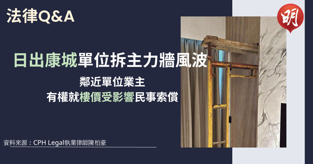 將軍澳日出康城首都近日有單位被揭擅自打穿主力牆,屋宇署初步評估認為樓宇整體結構無危險,惟不合標準,要求業主於15日內展開修復,30日內完成工程。事件惹來肇事單位周邊的單位業主關注,擔心樓宇結構問題可能造成的影響。明報電子平台組訪問了CPH Legal執業律師陳柏豪,解釋事件可能引伸的法律爭議。