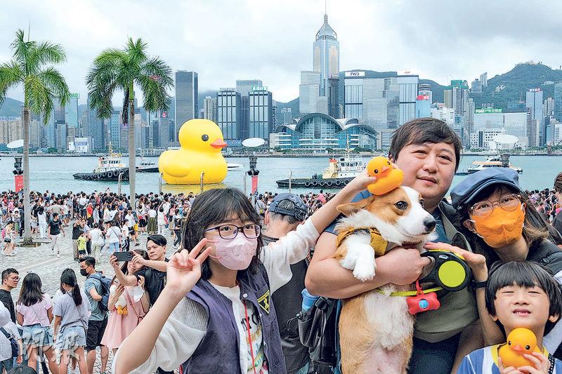 昨日的海上巡遊從中環出發,途經銅鑼灣避風塘、炮台山東岸公園主題區再游向尖沙嘴星光大道和文化中心,歷時逾兩小時。黃鴨巡遊速度頗快,經過尖沙嘴海旁時,岸上逾千人一同跟着黃鴨由尖東急步走向天星碼頭爭相「打卡」,一度擠滿星光大道。有市民指現場太多人,「影到頭,影唔到鴨」。