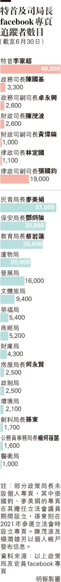 綜觀各專頁的追蹤人數,15個不超過1萬(見右圖),其中李家超的專頁自去年6月底開設至今,有4萬個追蹤者,為眾人最多,其次是民青局長麥美娟的3.7萬,但其專頁自2014年擔任議員時已設立;至於最少追蹤者的分別是財政司副司長黃偉綸及醫務衛生局,經過約一年運作的兩個專頁各有約1000名追蹤者。