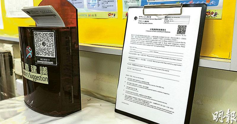 除網上填報,實體預設表格已可在各公共圖書館索取。本報記者昨走訪多間圖書館,在柴灣圖書館近門口櫃台的「讀者建議」箱旁已見放有表格。中央圖書館職員在記者查詢後,示意表格在櫃台服務的意見箱旁。