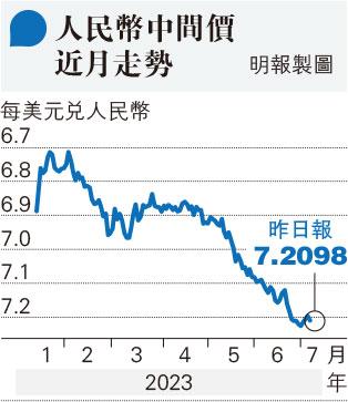 華僑銀行香港經濟師姜靜表示,繼內地周三公布的6月財新服務業PMI,確認服務業恢復動能趨弱後,另有消息傳出違約發展商在司法拍賣未能找到買家,加上內地6月房地產銷售好壞參半,市場預計國內房地產債務危機將面臨更多挑戰。她指在中國官方推行更多刺激經濟增長措施前,短期內人民幣對美元或續見於偏弱整固,技術上可關注離岸人民幣的支持位在7.2857,阻力位則在7.2181。
