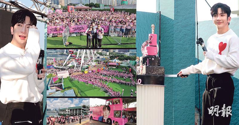 【明報專訊】MIRROR成員「教主」盧瀚霆(Anson Lo)昨日28歲生日,神徒(粉絲暱稱)以「Keep Giving.Keep Loving」為主題,為偶像安排連串應援活動慶生,包括乘搭觀光巴士、來回中環至尖沙嘴的天星小輪、乘坐摩天輪及旋轉木馬,以及食雪糕,一律免費,每處應援點都人頭湧湧好熱鬧。Anson Lo前晚在社交網預告昨午5時現身中環跟神徒見面慶祝,大會實施人流限制,場內有逾千名神徒,場外則有過萬神徒圍觀。Anson Lo在台上感謝神徒支持時感觸落淚,承諾做好作品回報。