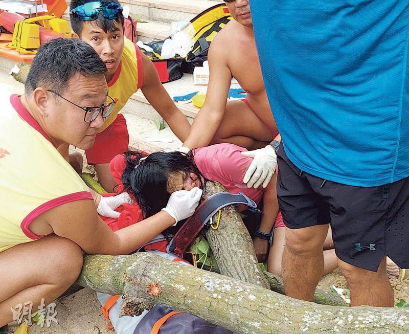 昨3號風球生效期間,本港多區有大樹塌下,當中南區南灣泳灘一棵約12米高大樹下午4時許塌下,壓着一名43歲外籍女子,她頭部受傷昏迷,四肢擦傷。泳灘救生員協助急救及報警,救護員到場時,她已漸回復清醒,由救護車送院,治理後情况穩定。據了解傷者為菲傭,冲身後在更衣室外等外傭朋友期間,一棵長在更衣室後方斜坡的大樹突然向沙灘方向倒塌,主樹幹倒在更衣室對開梯級及沙灘,另有多段枝葉散落附近冲身設施。