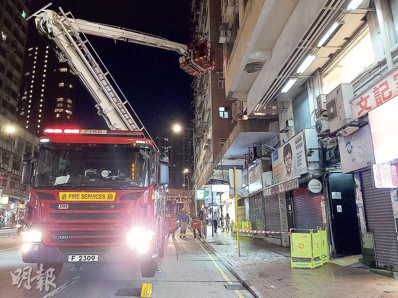 現場為筲箕灣道麗灣大廈,樓齡58年。昨晚近6時半,大廈簷篷一幅約10吋乘15吋大的石屎剝落擊中27歲男途人,他頭部受傷流血,送東區醫院治理。屋宇署事後派員到場調查,其間消防架起雲梯,讓屋宇署人員視察剝落位置、敲鑿外牆石屎。