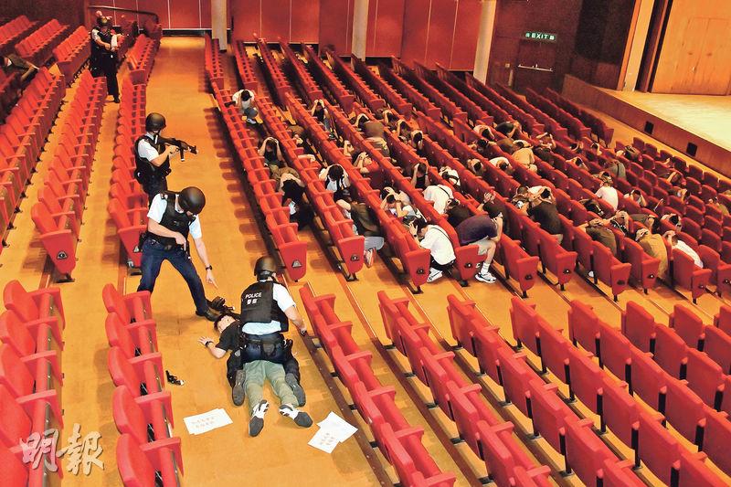 演習合共約一個多小時,分為四大部分,包括模擬香港大會堂有恐怖分子持刀欲襲擊市民,又有人持雙槍威嚇。警方與恐怖分子一度爆發「槍戰」,有響彈模擬槍聲,亦有火光從槍械冒出,場面逼真,參加者需戴耳塞。