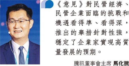 【明報專訊】內地提出《關於促進民營經濟發展壯大的意見》(下稱《意見》)後,多家民企龍頭紛表態支持,騰訊(0700)創辦人兼主席馬化騰便發表千字文支持;小米(1810)董事長雷軍表示,對此深有感觸,認為《意見》釋放出引導民營企業踐行新發展理念的明確政策信號。