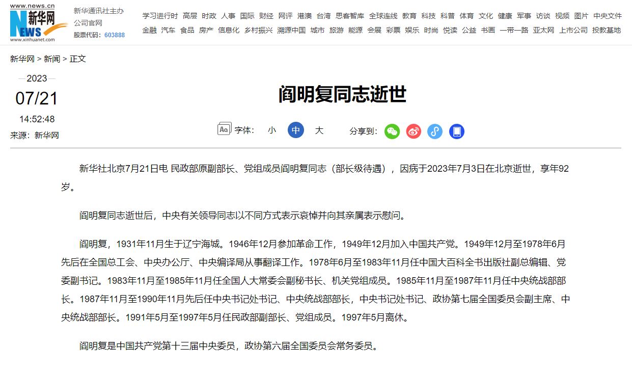 新華社刊發閻明復逝世消息 (16:43)