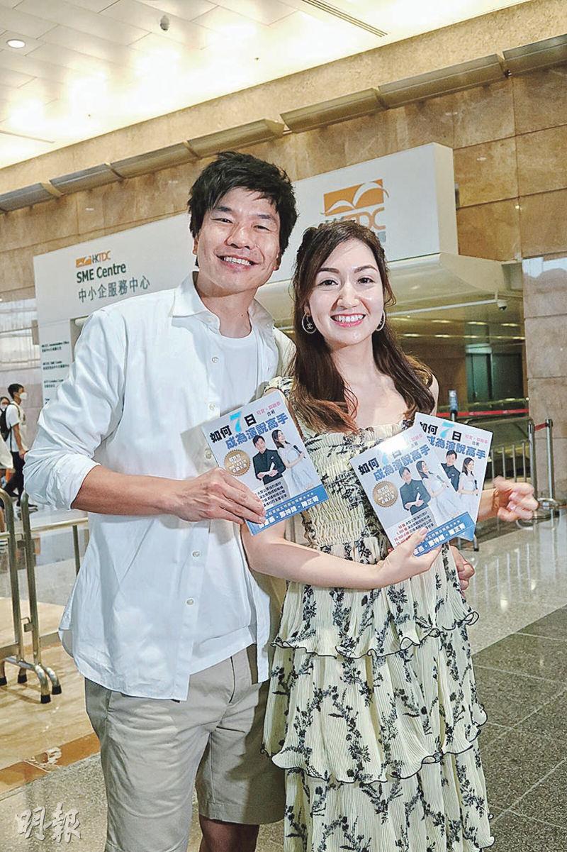 【明報專訊】可宜與鄭啟泰前晚在書展舉行新書簽名會,裕美、林祖輝等到場支持。可宜穿鬆身裙孕味濃,笑言剛與老公去英國、蘇格蘭、希臘度蜜月回港,被親友追問造人大計,「我們都想生BB,已好勤力,希望下次出育嬰書。可能旅行行程太過緊密,我們都好疲累,老公還扭傷腳」。可宜自嘲中文不太好,寫書試過歎慢板,差點趕不及交稿,最終成功推出中文書是奇蹟,多謝老公和親友支持,聽到銷量不錯,開心又感動,「新書分享公開演說、做司儀的技巧,以前好多蝦碌經驗,遇到公司老闆跌倒五體投地、獎項跌落地、讀錯嘉賓名、嘉賓甩鞋情况」。